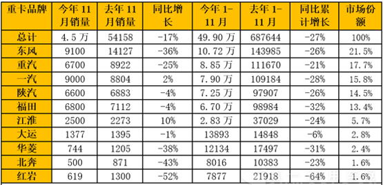 17%的同比降幅,也意味著(zhù)重卡市場(chǎng)在10月份的月度降幅大幅縮窄后(從9月份的23%降幅縮窄到10月份的12%),在11月份再度擴大。