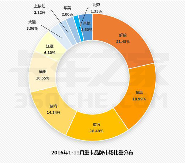 1-11月銷(xiāo)量累計前5的企業(yè)合計占去81.80%的重卡市場(chǎng),和上一年的水平基本持平,其中解放今年占21.43%的市場(chǎng)比重,較去年的15.73%,多出近7個(gè)百分點(diǎn),而其他4家則多多少少有些下滑,這也說(shuō)明了解放的市場(chǎng)今年明顯擴大。