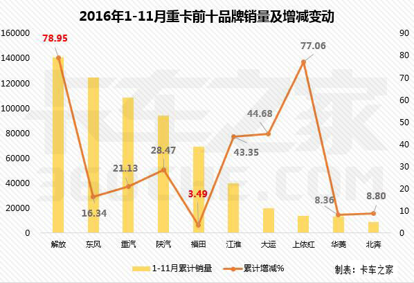 然而,值得注意的是,銷(xiāo)量前10的企業(yè)中4家跑贏(yíng)了大盤(pán),除解放外,江淮、大運、上依紅雖然累計銷(xiāo)量排名略微靠后,但增長(cháng)幅度毫不遜色。相反,銷(xiāo)量第5的福田僅以3.49%的漲幅,排名墊底。