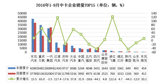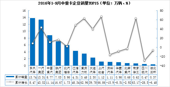 2016年1-9月中重卡企業(yè)中,東風(fēng)汽車(chē)銷(xiāo)量排名第一,累計銷(xiāo)量達到13.74萬(wàn)輛,同比增長(cháng)8.47%;銷(xiāo)量前十五企業(yè)中,重慶力帆、上汽紅巖和南京徐工銷(xiāo)量增長(cháng)較大,增幅均超過(guò)60%。