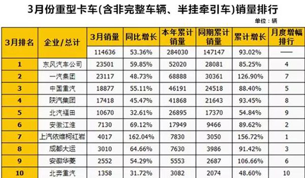 3月重卡銷(xiāo)量排行:東風(fēng)取代一汽居首
